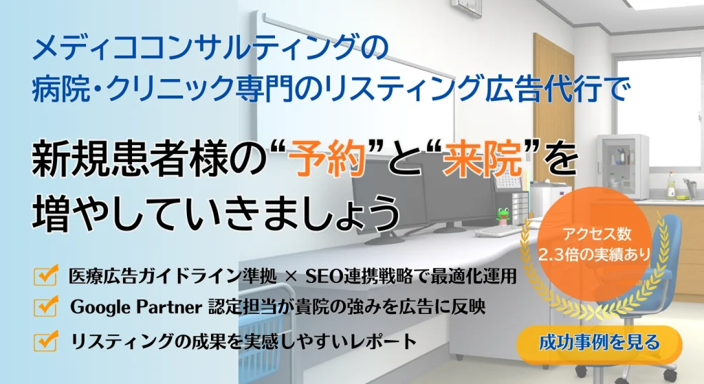 医療機関専門のWEBマーケティング会社として、内科・整形外科・皮膚科・泌尿器科・消化器内科など、幅広い診療科のリスティング広告運用を支援してまいりました。